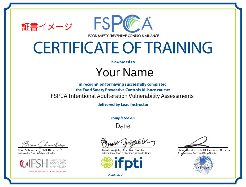 このトレーニングでFDQI食品防御適格者としての認定を受け、FDAの意図的混入IAルールに基づく食品防御計画の作成と実施方法を学びます。