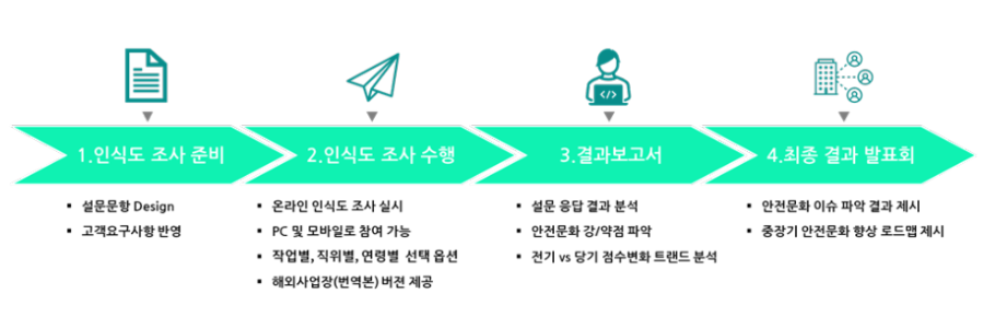 안전문화 인식도를 실시함으로써 귀사의 안전 문화와 안전 의식을 향상 시킬 수 있습니다.